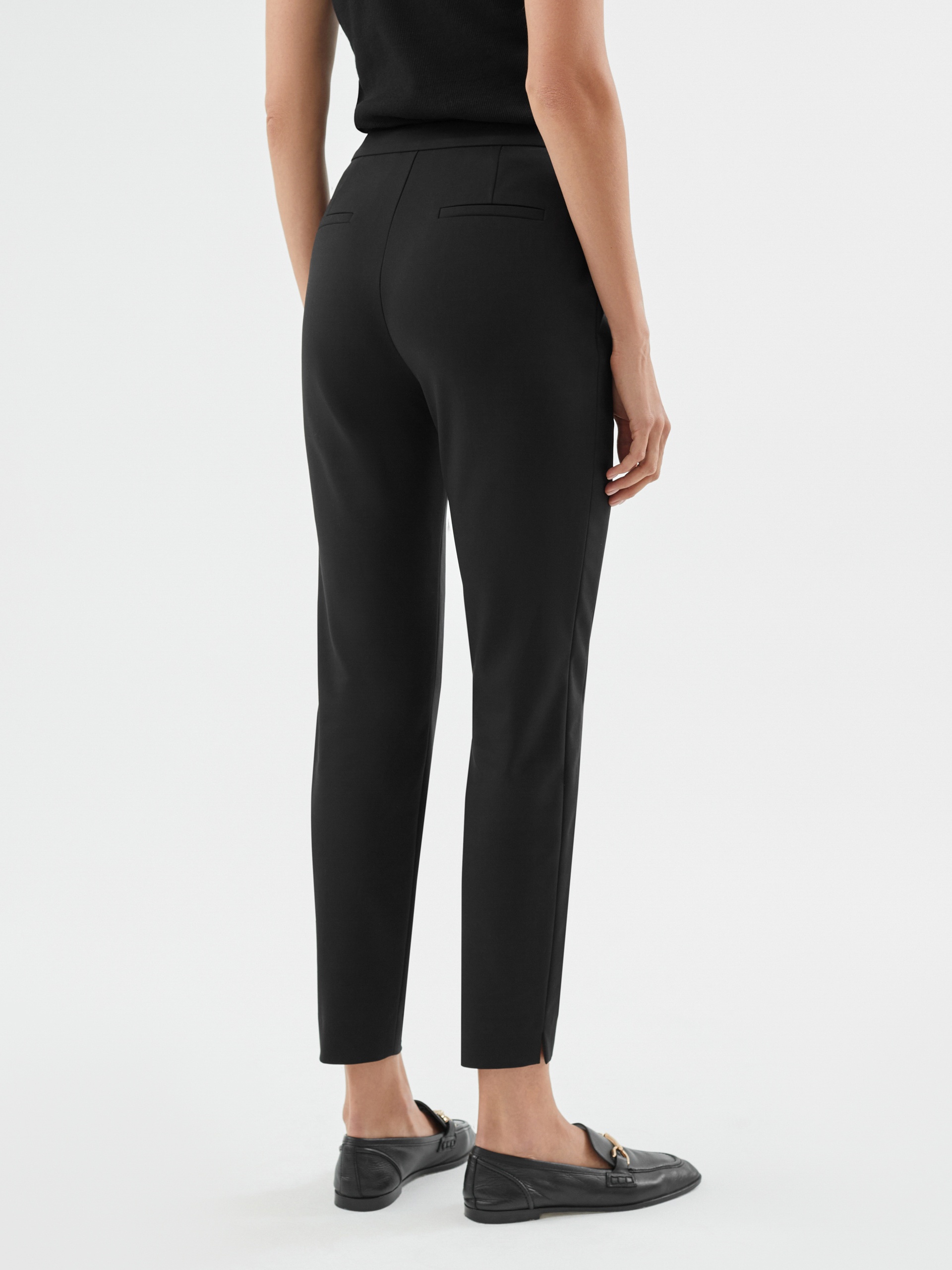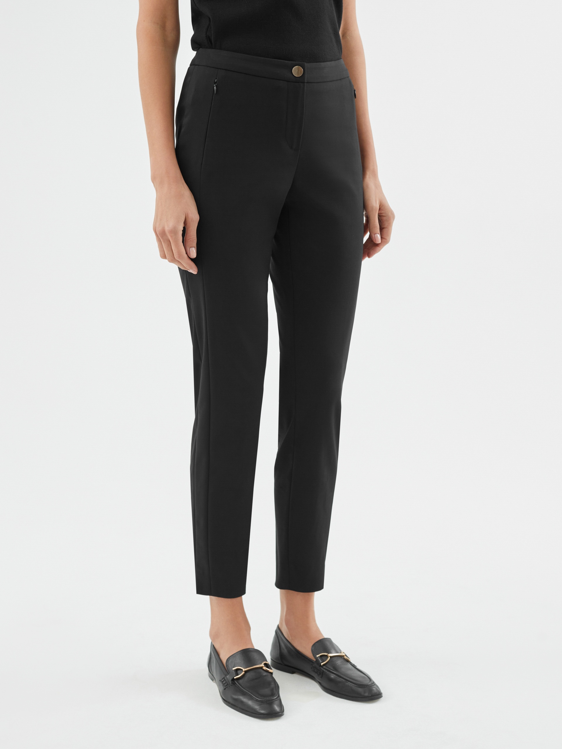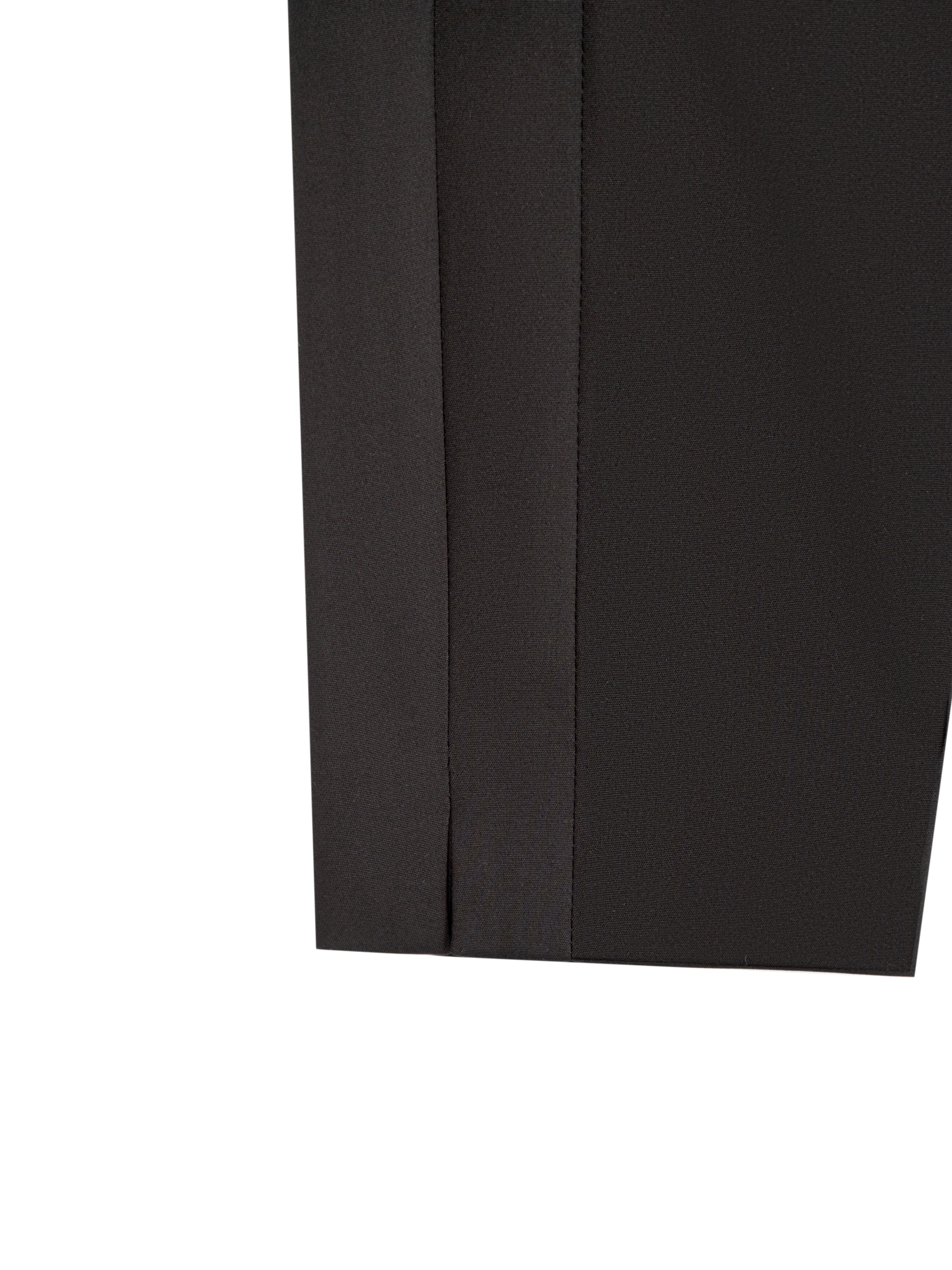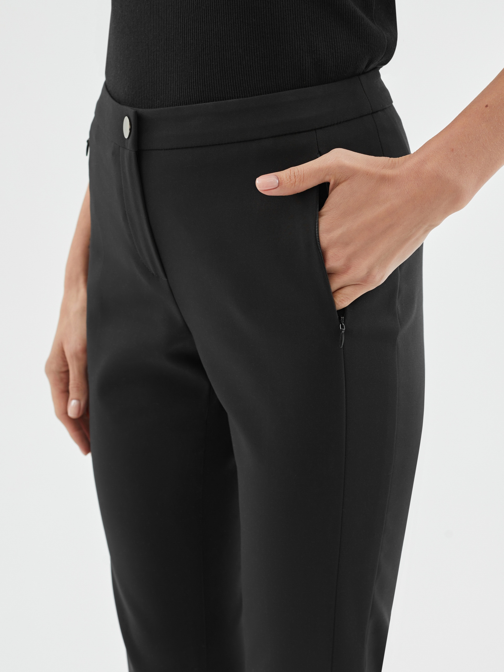 Брюки зауженного силуэта на притачном поясе, с лампасами и стрелками. Карманы в боковых рельефах. Застежка спереди на молнию и пуговицу. По низу маленькие разрезы.