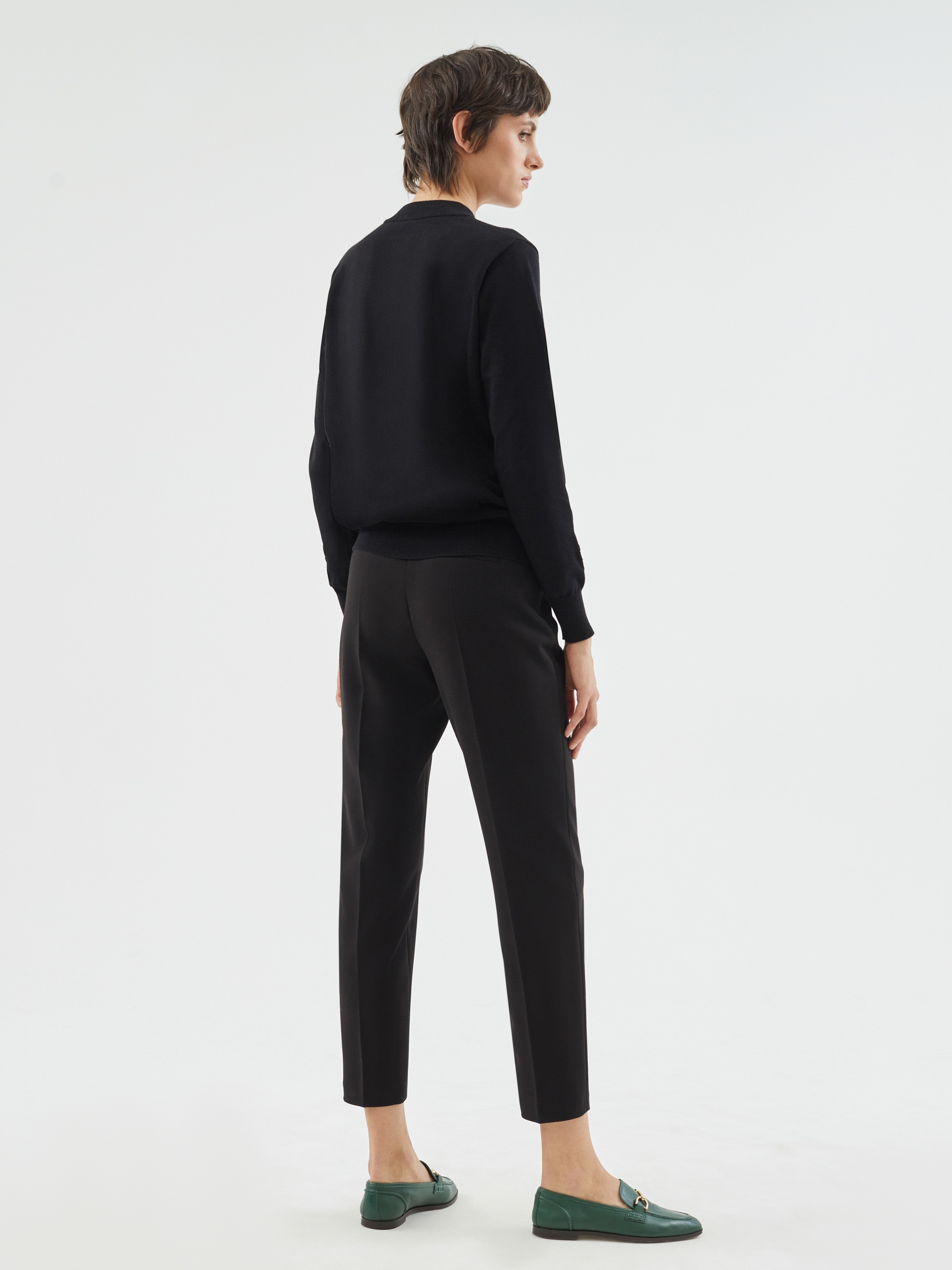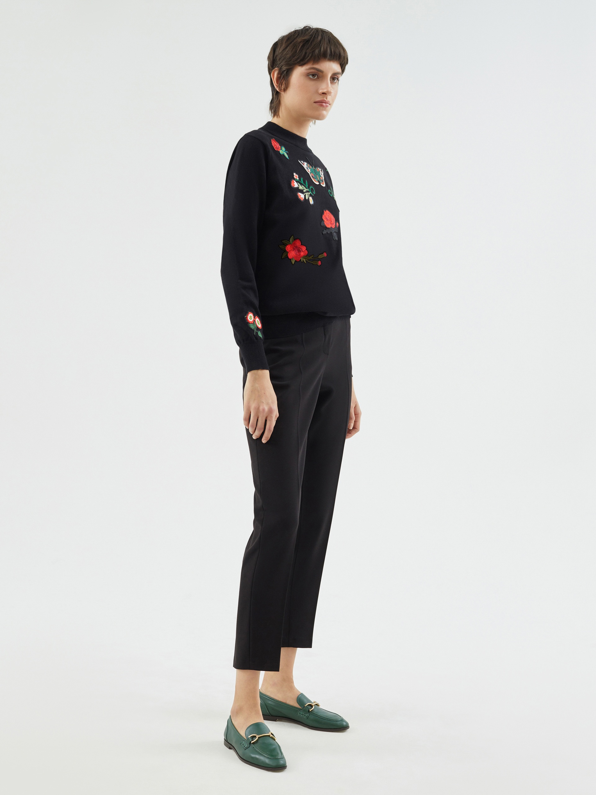 Базовый джемпер в черном цвете прямого силуэта, декорирован эффектными пэтчами, с вышивкой по полочке и рукавам.