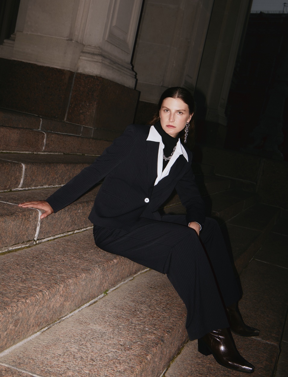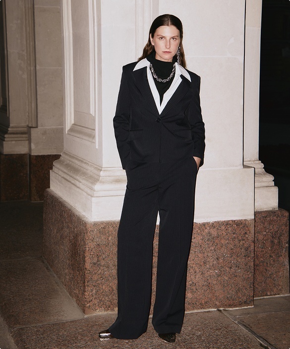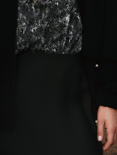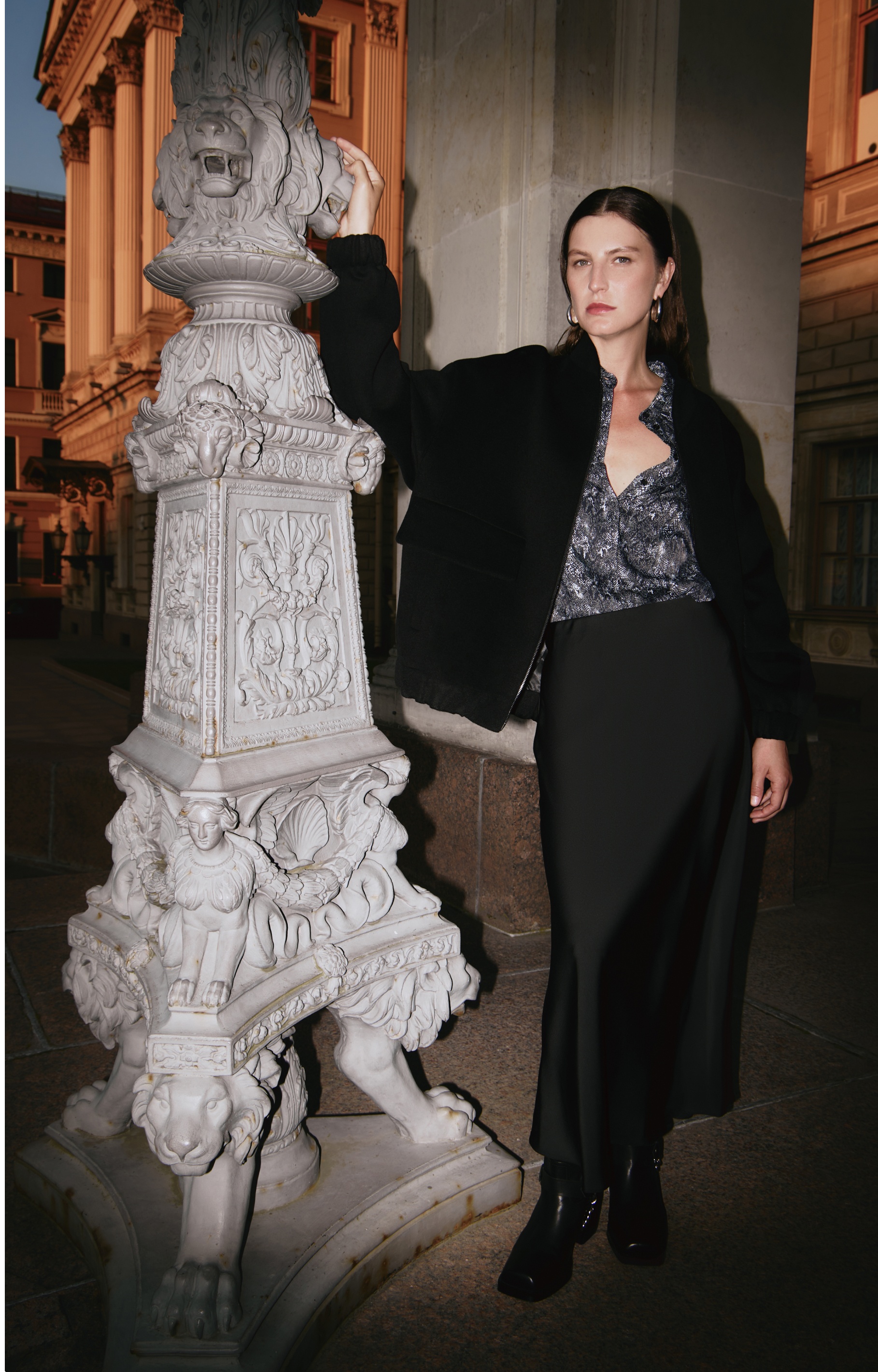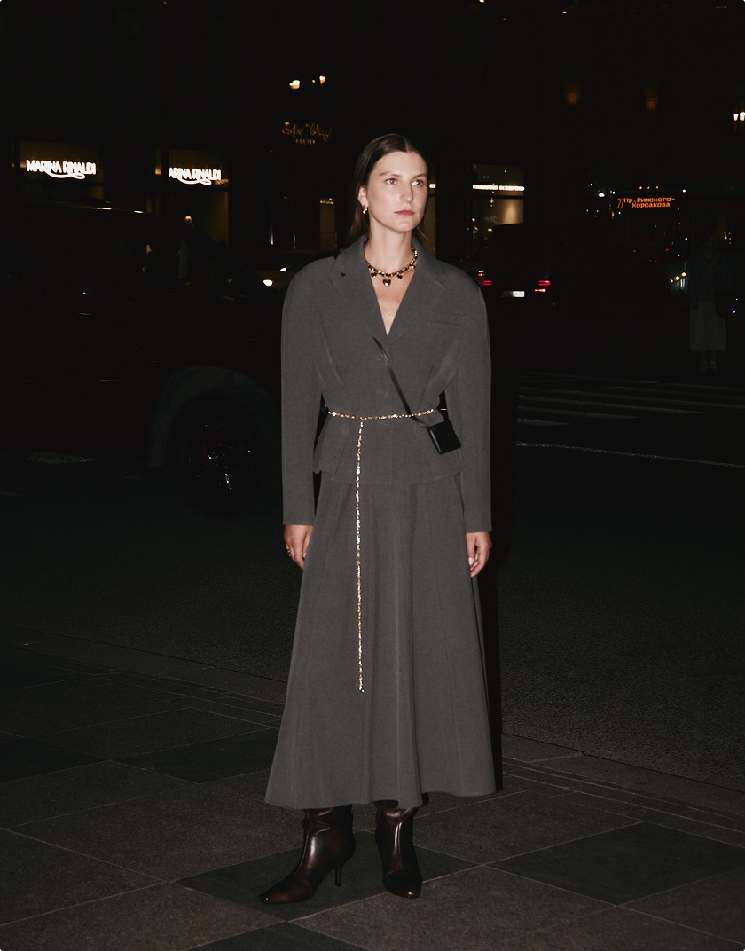 Классические костюмы обретают новую жизнь благодаря элементам «рваного» кроя, блузки изысканно «помяты» в нежной жаккардовой текстуре, а змеиный принт предстает в благородных серебристо-серых тонах.