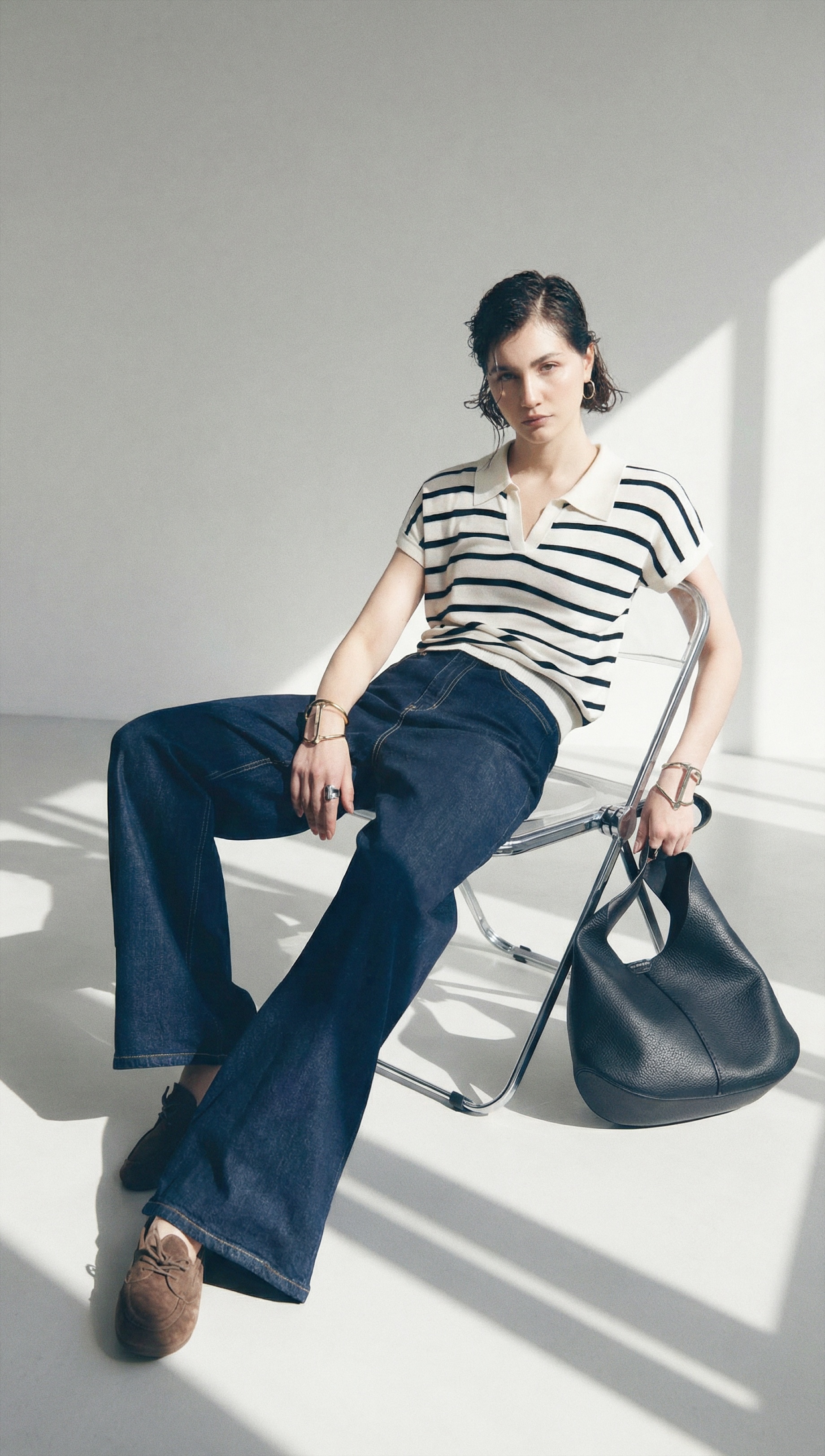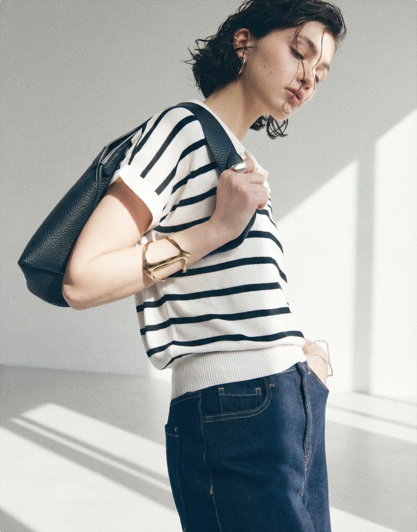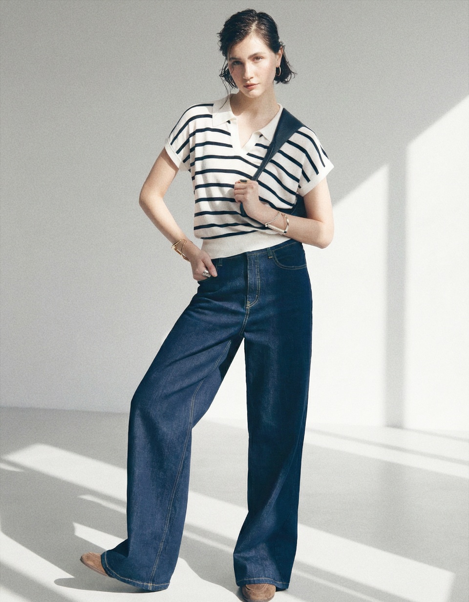 Морской стиль переосмыслен: полосатый кардиган из джерси комбинируем с широкими синими брюками. А для повседневных будней — вечная классика: джинсы клёш и белая рубашка с отложным воротником.
