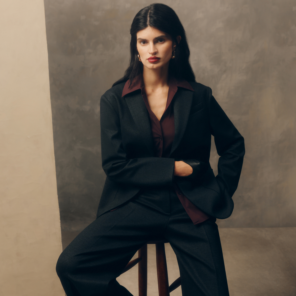 Серый костюм из приталенного жакета с акцентными плечами и струящейся юбки из плотной ткани формирует силуэт «песочные часы». Такой комплект — настоящая база, которую легко адаптировать под настроение: с массивными, грубыми деталями он составит дерзкий и смелый образ, а в сочетании с классическими аксессуарами — универсальный и сдержанный look, подходящий для разных ситуаций.