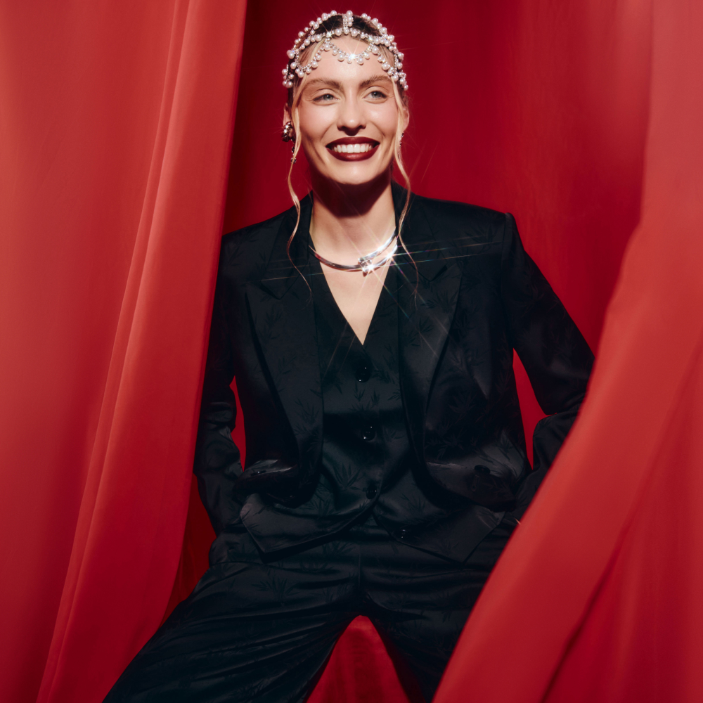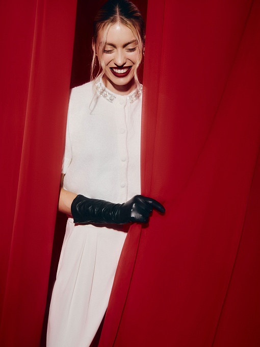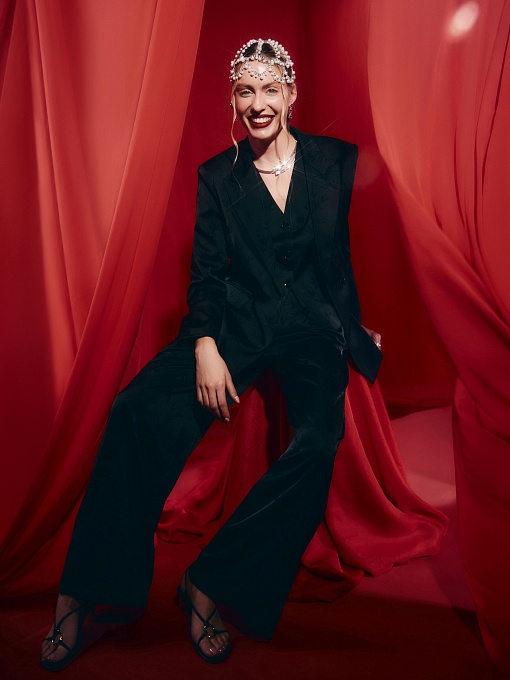 Фактурный молочный твид придаёт образу структурную выразительность и ощущение благородства за счёт плотной и рельефной текстуры. Пайетки в этом наряде выполняют ключевую роль — они добавляют изысканный блеск и создают праздничный акцент, не перегружая общую строгость ткани. Такое сочетание идеально подходит для коктейльных мероприятий: классика твида встречается с современным блеском пайеток, создавая женственный и актуальный образ с лёгкой праздничной ноткой.