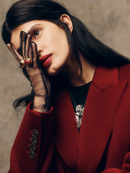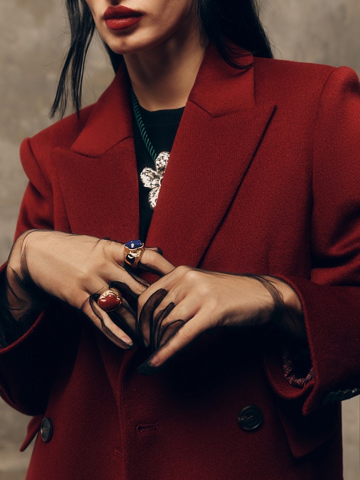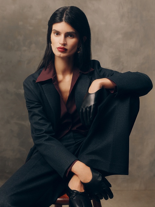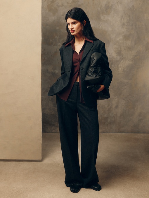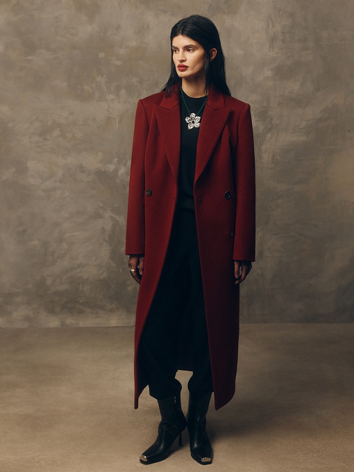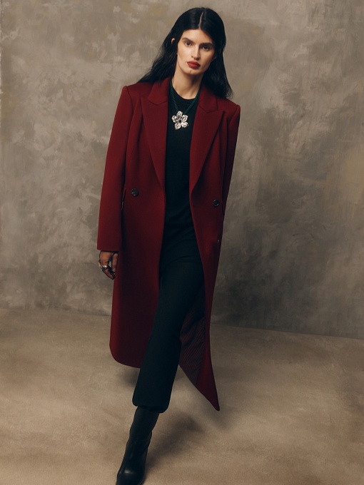 Костюм из фактурного трикотажа в черном цвете создаёт идеальный фон, позволяя бордовому пальто выйти на первый план. Такой дуэт выглядит уверенно и благородно: бордовый оттенок добавляет глубину и характер, позволяя выделяться в толпе, а чёрный сохраняет гармонию и строгость. Завершите образ запоминающимися аксессуарами — и получите безупречный баланс силы и утончённости.