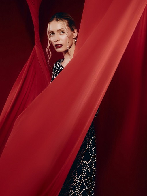 Монохромная палитра, особенно черная, отлично подходит для экспериментов с текстурами. Она позволяет создавать глубину и визуальный интерес без использования цвета, делая акцент на тактильных и визуальных качествах материала. Мягкое и нежное платье-кимоно укутывает и создает силуэт распустившегося цветка, придавая образу женственность и легкость.