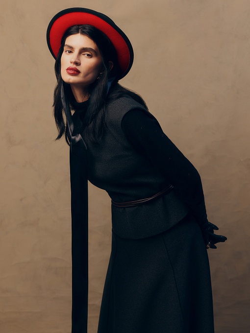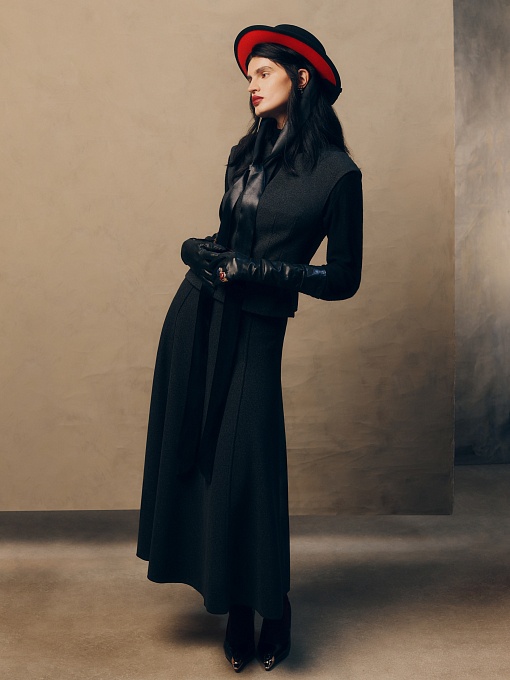 Дуэт из приталенного жилета и расклешенной юбки формирует силуэт «песочные часы», создавая образ, в котором строгость и женственность гармонично дополняют друг друга. Контраст матовой ткани костюма с блестящими аксессуарами из кожи и атласа придаёт образу живость и глубину. Игра с фактурами помогает разбавить строгость темных оттенков, делая комплект универсальным для дневных и вечерних выходов.