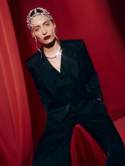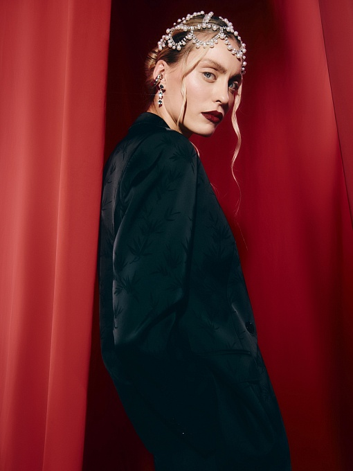 Черный жаккардовый костюм — отличное решение для тех, кто ценит сочетание классики и современных тенденций. Его универсальность позволяет использовать комплект как в офисной среде, так и для вечерних встреч — всё зависит от правильно подобранных украшений и аксессуаров. В деловом образе он подчёркивает утонченность и статус, создавая серьёзный и стильный вид. Для праздничных мероприятий — легко трансформируется с помощью ярких акцентов в украшениях и изящной обуви, добавляя образу выразительности и праздничного настроения.