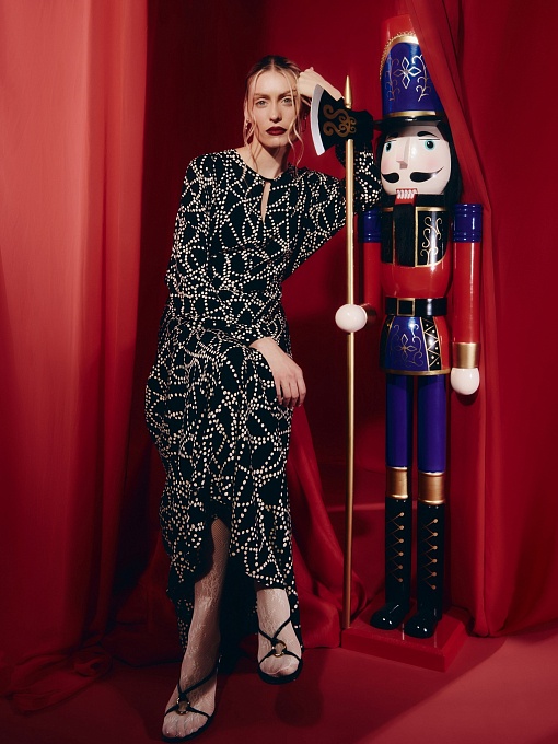 В то же время платье прекрасно впишется в повседневный гардероб, если добавить к нему более практичные элементы: сапоги, стильное пальто и высокие кожаные перчатки. Такое сочетание придаст образу современный, но при этом элегантный вид, сохраняя комфорт и функциональность.