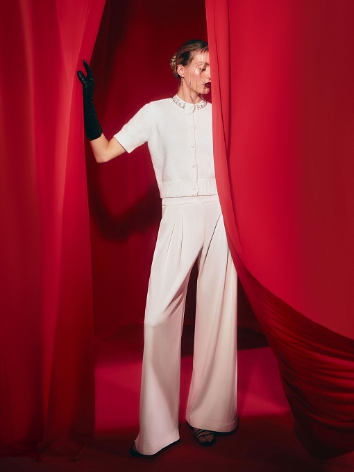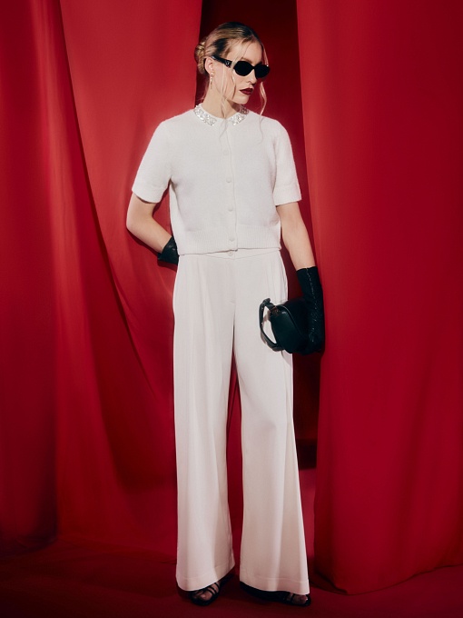 Струящиеся брюки палаццо молочного оттенка и мягкий пушистый кардиган создают гармоничный и стильный комплект в духе парижского шика. Контраст фактур — гладкая текстура брюк и объемная фактура кардигана — добавляет образу глубину и изысканность, делая его визуально интересным и утончённым. Декорированная горловина кардигана подчеркивает женственность и придаёт дополнительный элемент элегантности. Свободный крой брюк с легкими складками обеспечивает комфорт и позволяет образу выглядеть легко и непринужденно.