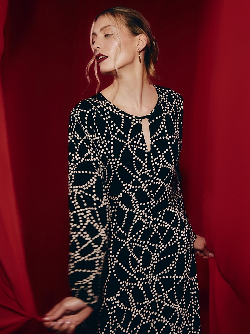 Струящееся платье с жемчужным принтом выглядит как произведение искусства — оно идеально подходит для вечерних выходов и особых встреч. Акцентные украшения подчеркнут его изысканность и сделают образ завершённым и эффектным.
